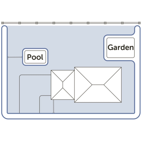 This layout is ideal when you are containing a portion of your property, but also want to keep your out of certain areas within the containment area. The highlighted graphic indicates where the pet is allowed to go.